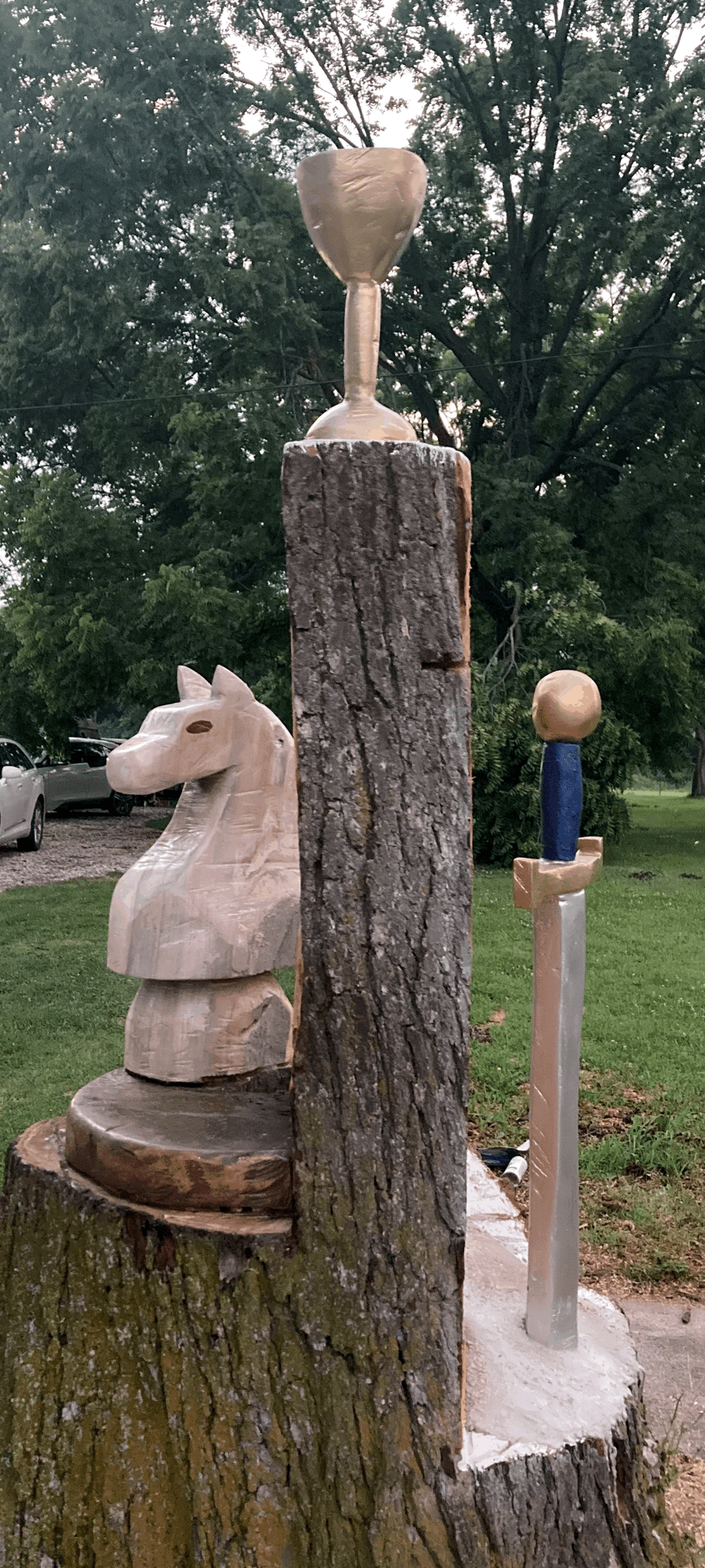 From the living stump — its heart rebuilt with poured stone — three emblems rose: